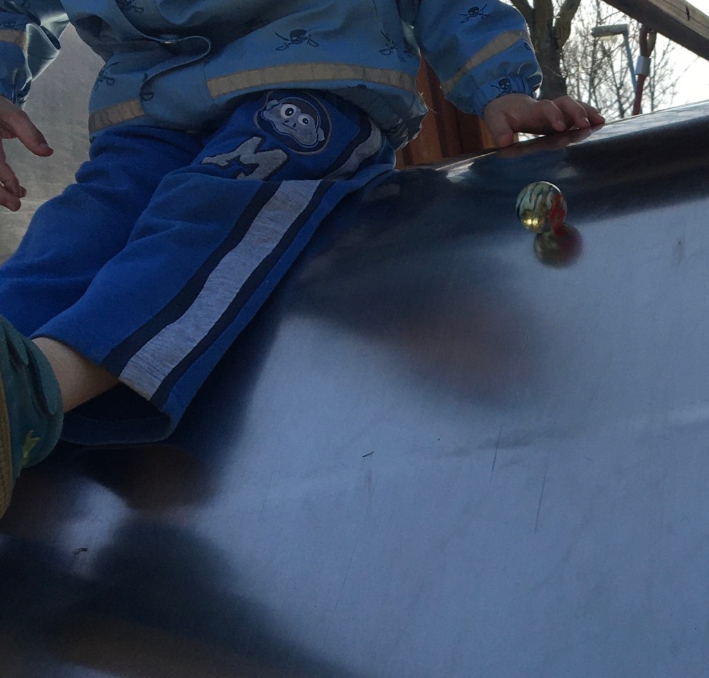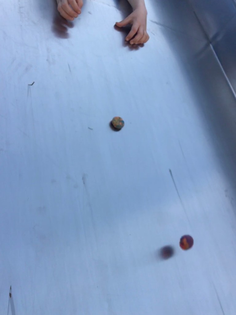 Probiert es aus, auf einer Rutsche (in Corona Zeiten bitte nur auf der eigenen) oder einer anderen schrägen Ebene, wie z.B. (Regal)Brett, Buch…