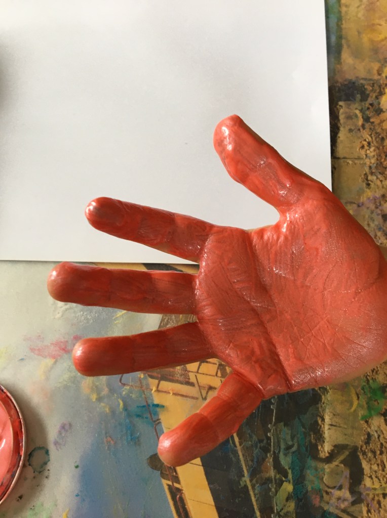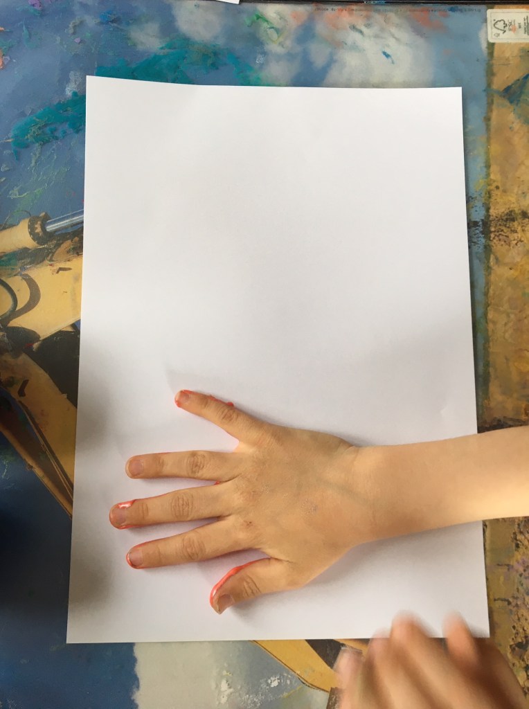 „Dann die Hand auf das Papier drücken und mit der anderen draufdrücken.“
