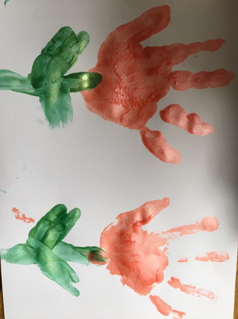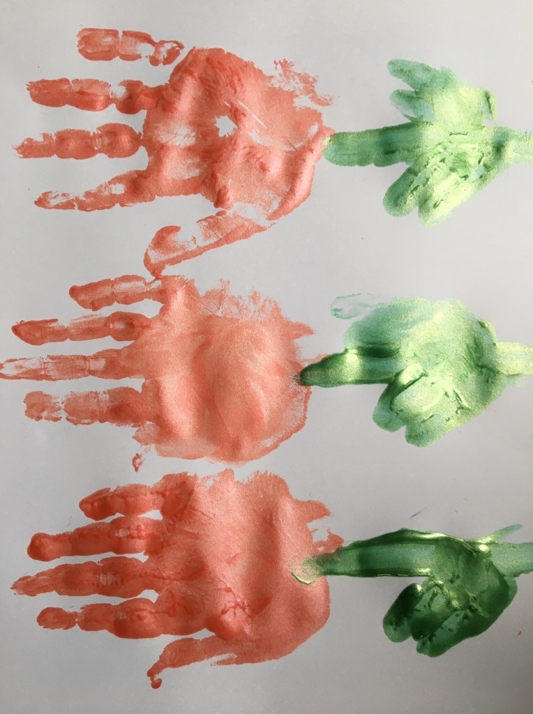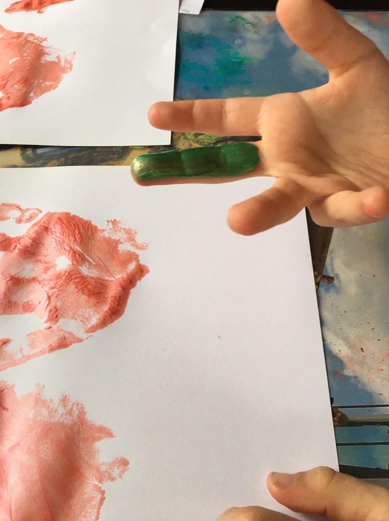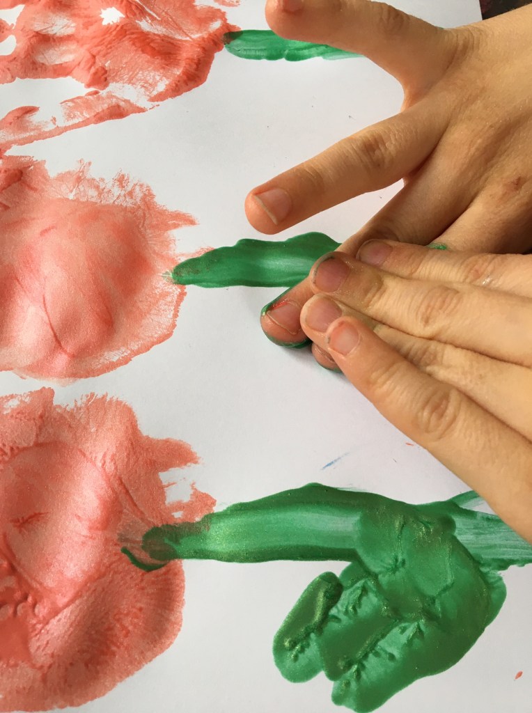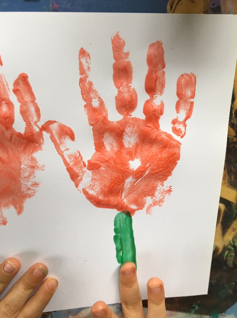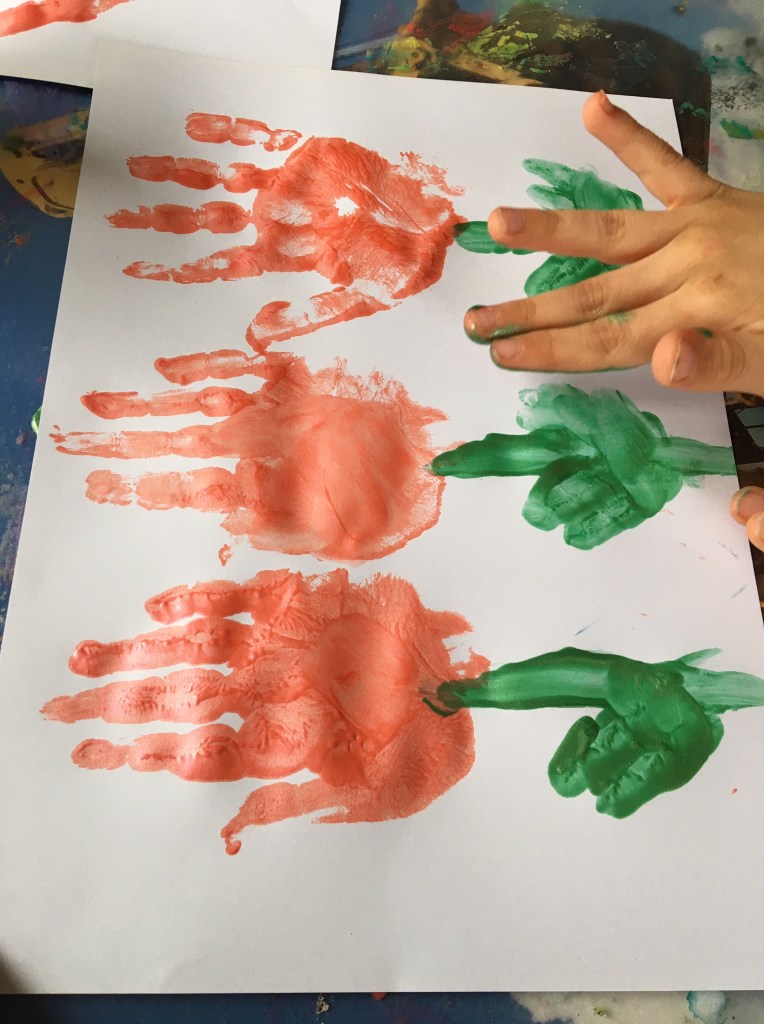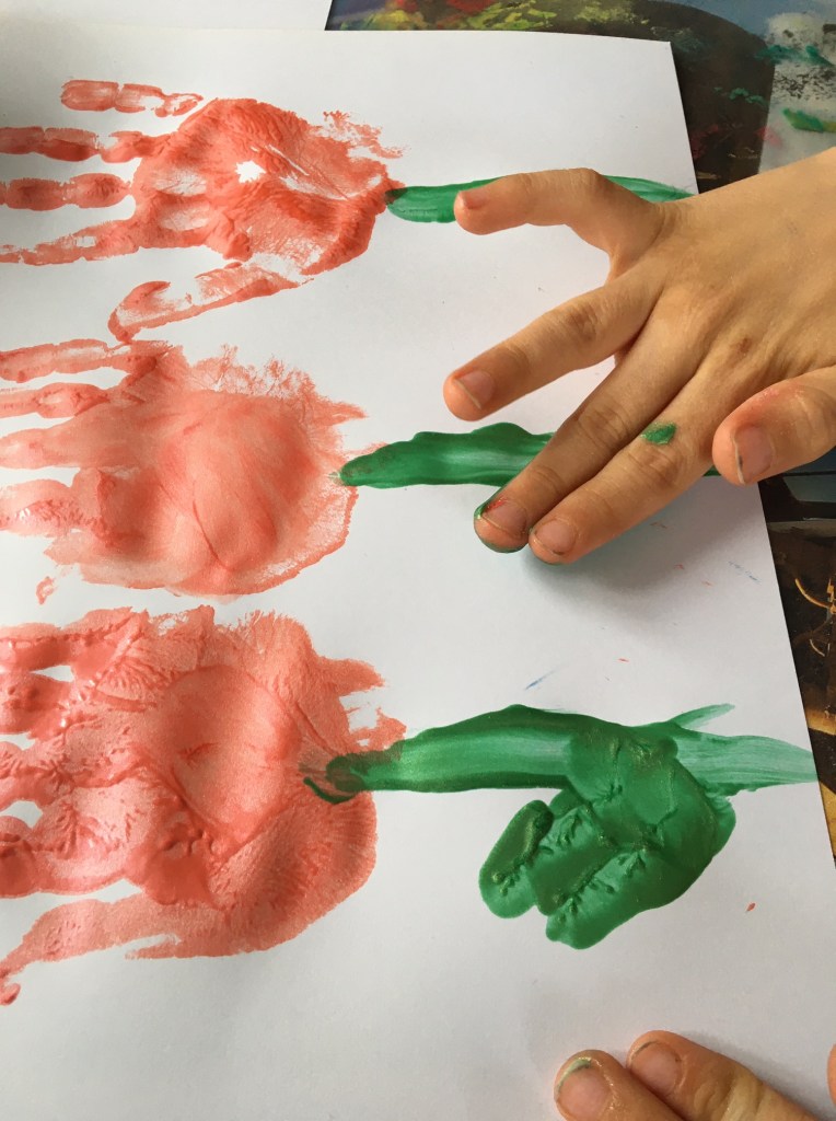 „Jetzt muss man den Mittelfinger mit grün anmalen, weil der am längsten ist! Das wird dann der Stiel für die Tulpe.“