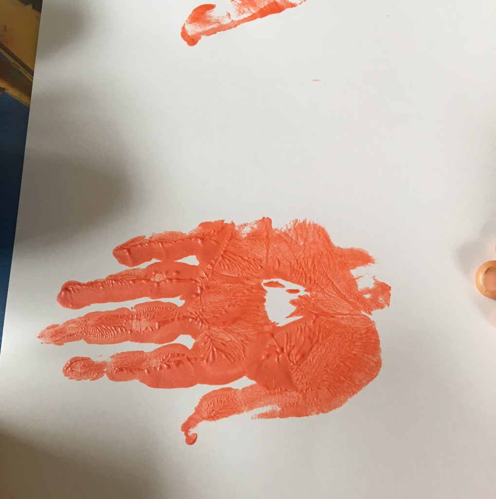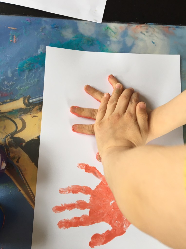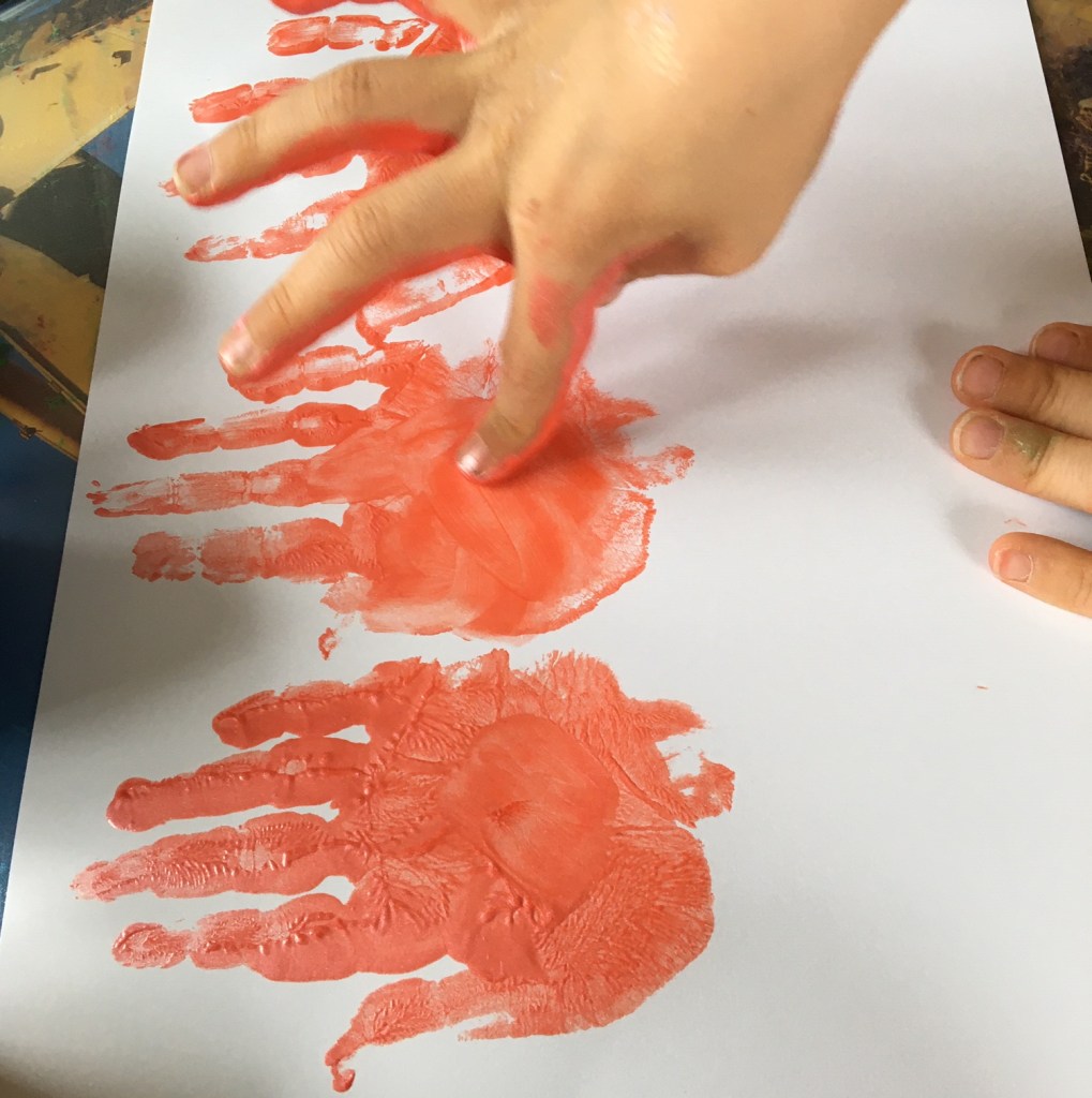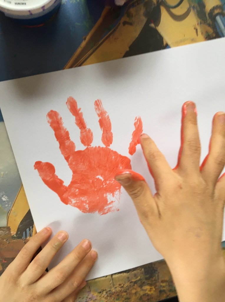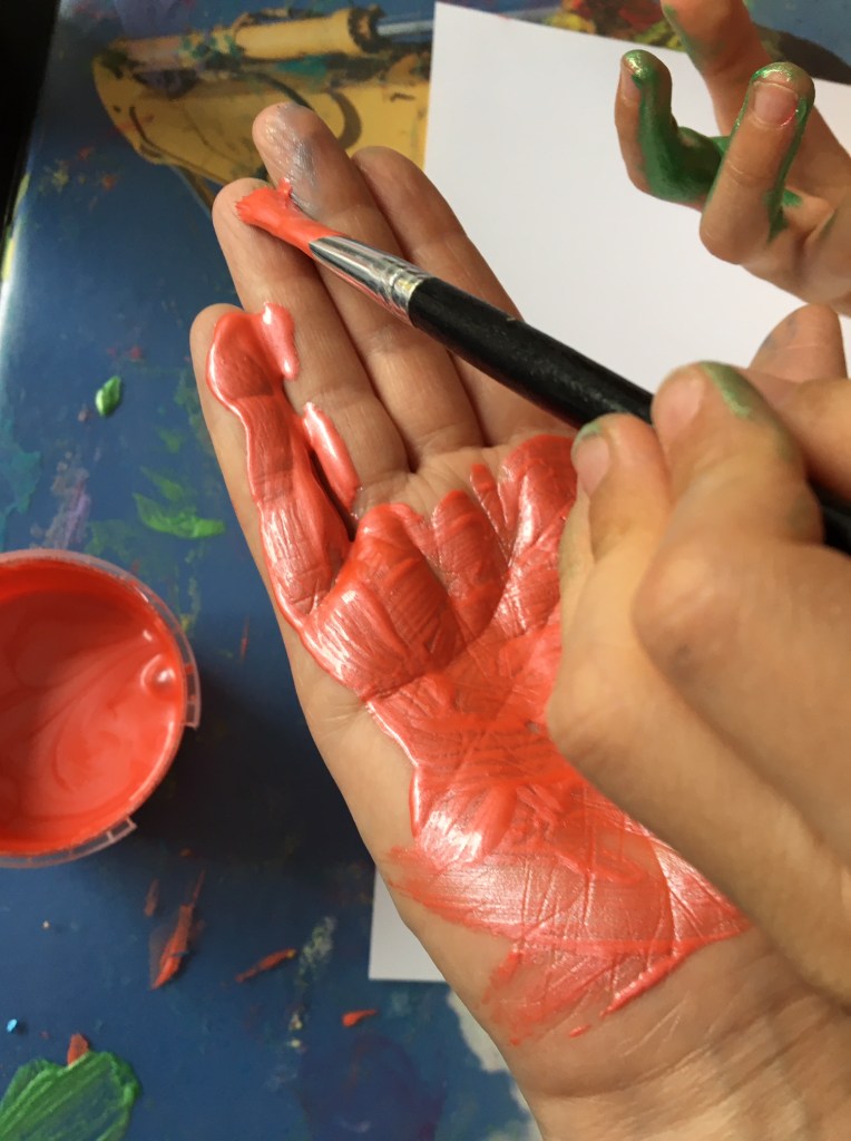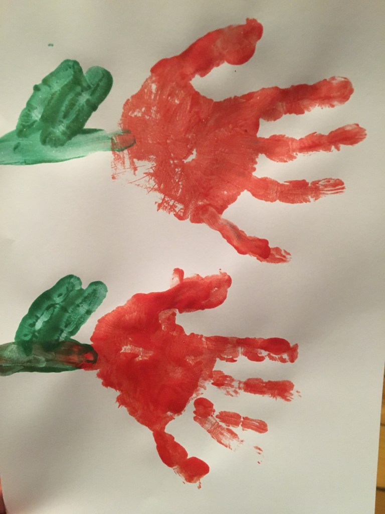 „Jetzt muss man den Mittelfinger mit grün anmalen, weil der am längsten ist! Das wird dann der Stiel für die Tulpe.“