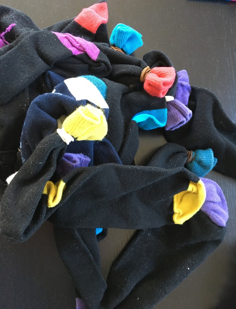 Nehmt gleiche oder wenigstens ähnliche Socken, packt verschiedene Dinge hinein und verschließt sie mit einem Gummiband.